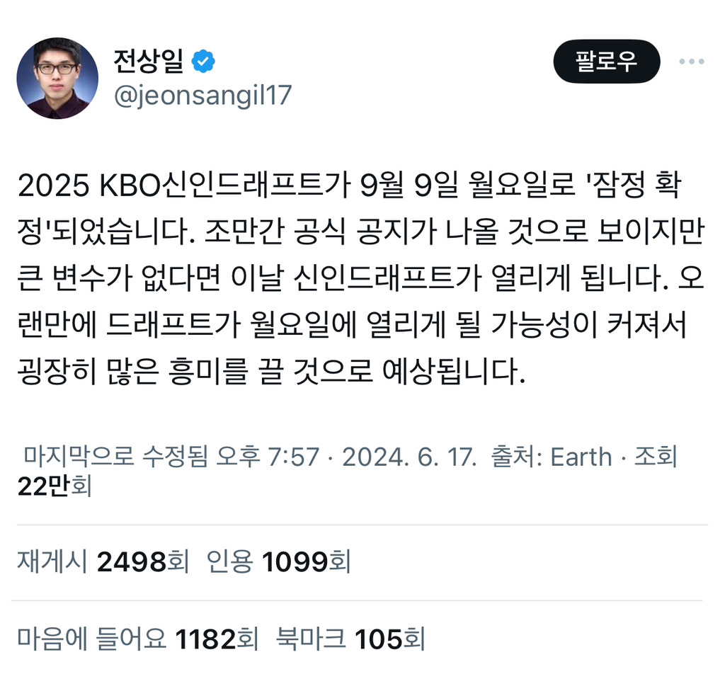 2025 KBO신인드래프트 9/9(월) '잠정 확정'