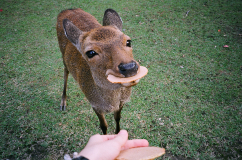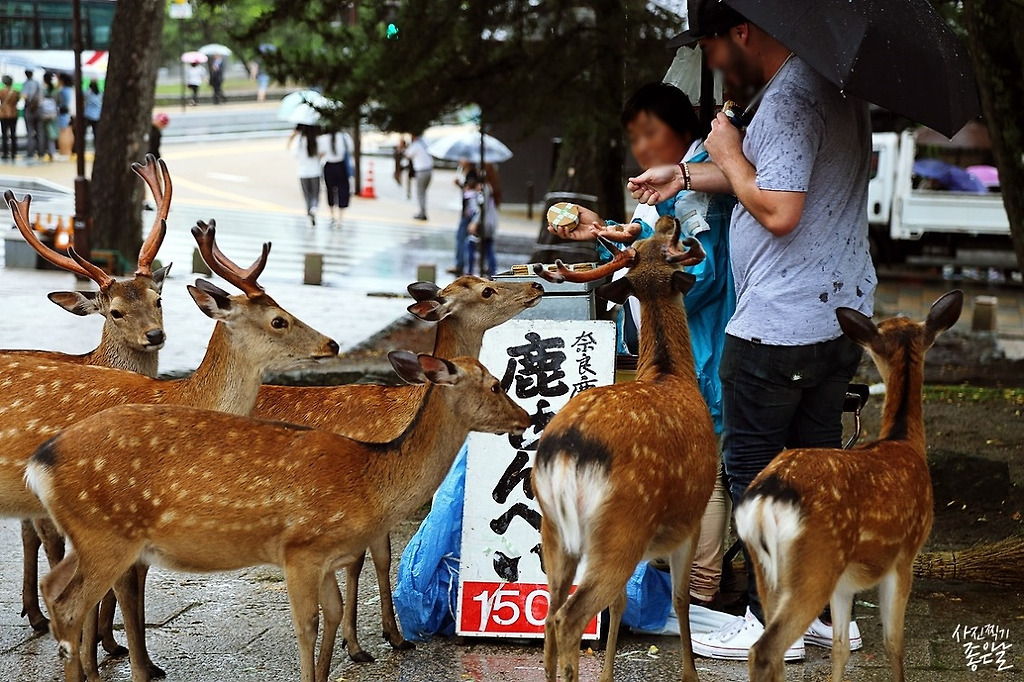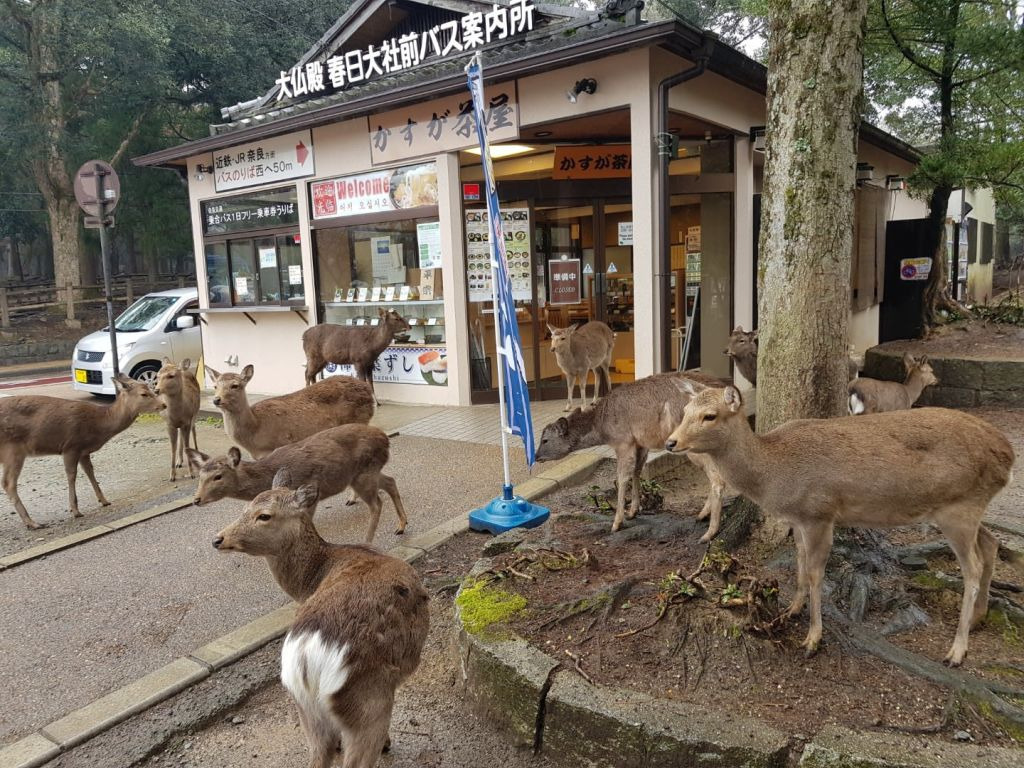 센베이 상인에게는 사슴들이 공격은 커녕 구걸조차 하지 않는데 보통 어린 새끼나 학습이 덜 된 사슴이 실수를 하지만 곧바로 상인의 제재를 받고 학습해 나간다. 이렇게 학습된 사슴의 새끼들도 어미를 따라 배우며 계속 이어지고 있는 나라 사슴들의 룰이며 지금도 센베이 노점 상인들의 빗자루 제재를 통해 철권통치(?)되고 있다. 그래도 나라의 신수이기 때문에 때리지는 않는다. 만일 그랬다간 공원과 시에서 상인이 계속 장사하게끔 놔두지 않는다. 그래서 사슴들은 센베이 노점상 대신 주위에서 관광객을 상대로 열심히 센베이 호객을 한다. 사슴이 센베이 상인 앞에서 관광객에게 호객하면 관광객이 상인에게 센베이를 사서 그 자리에서 주기 때문에 양자 모두 이득이며 이 관계를 사슴 그룹별로 힘의 우열 관계에 따라 돌아가며 행사하므로 모든 사슴이 잔뜩 몰려있지 않아 관광객도 부담이 덜하다. 그리고 센베이를 팔지 않는 상인들도 사슴들이 주변에 머물거나 굶주리지 않게 하려고 주기적으로 간식이나 먹이를 주며 돌봐주며 가게 문 앞에 죽치고 있어도 들어오지만 않으면 쫓아내지 않는다.