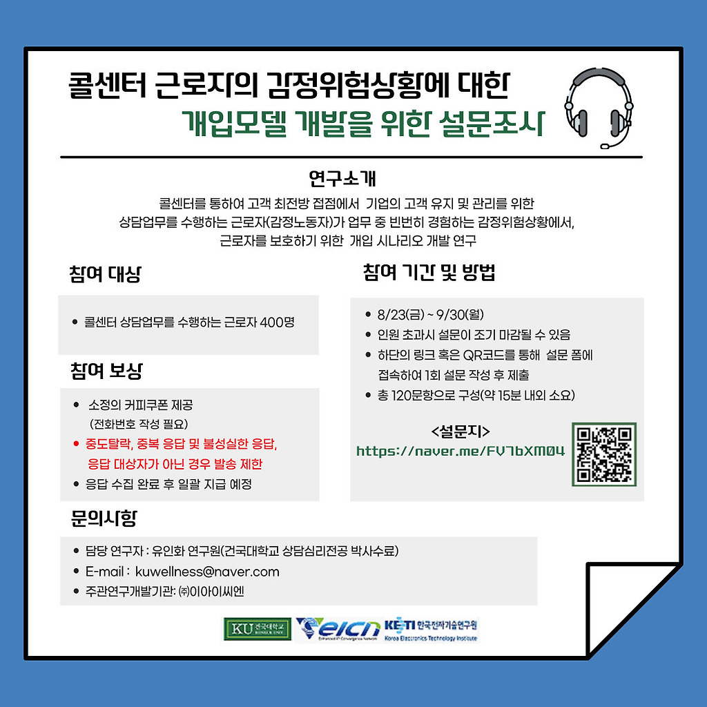 2. 본 설문조사 링크는 '콜센터 직원 대나무숲' 외에 다른 집단에 공유하지 않도록 부탁드립니다. (콜센터 상담원 외에 해당되지 않는 대상자가 참여할 수 있기 때문입니다. 꼭 유의 부탁드립니다.)
