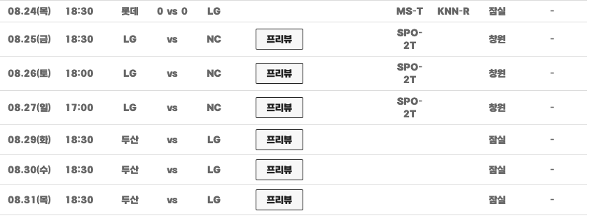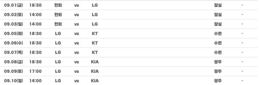 엘지트윈스 8/24(목)~9/10(일) 경기일정