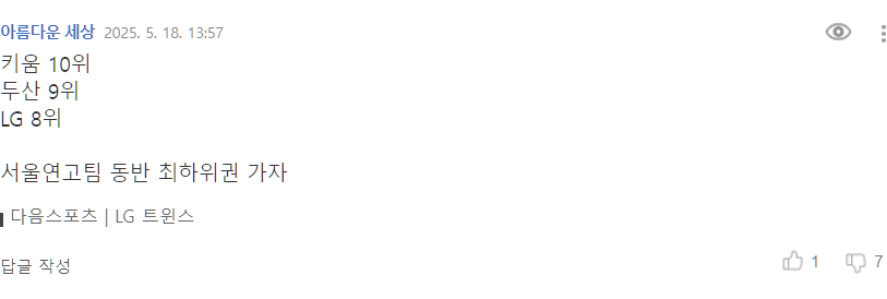 Daum닉네임 아름다운 세상 (=다음 테이블id? 렝프와 호잉988070) LG트윈스, 한화 이글스, 두산 베어스, 키움 히어로, 롯데 자이언츠 등 야구팀 비방하는 악플러이자 야구 안티 시비충입니다!!