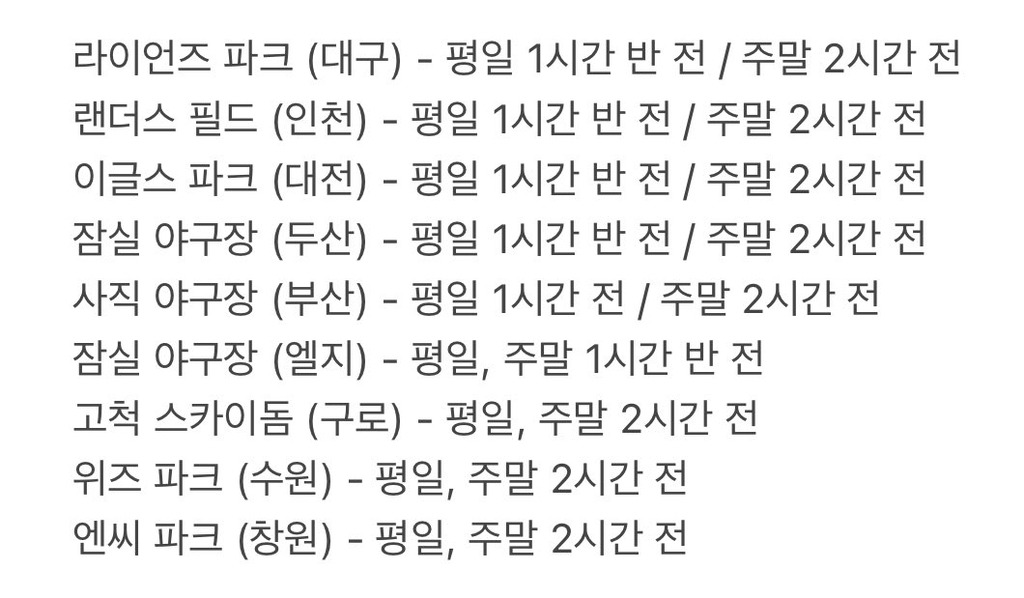🎇고척, 위팤, 엔팤 - 평일, 주말 2시간 전사직 - 평일 1시간 전 / 주말 2시간 전잠실 (엘지) - 평일, 주말 1시간 반 전라팤, 랜필, 이팤, 잠실(두산) - 평일 1시간 반 전 / 주말 2시간 전