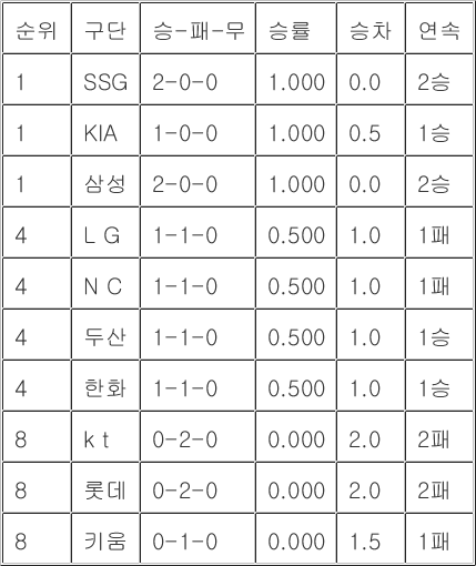 [프로야구 중간순위] 24일