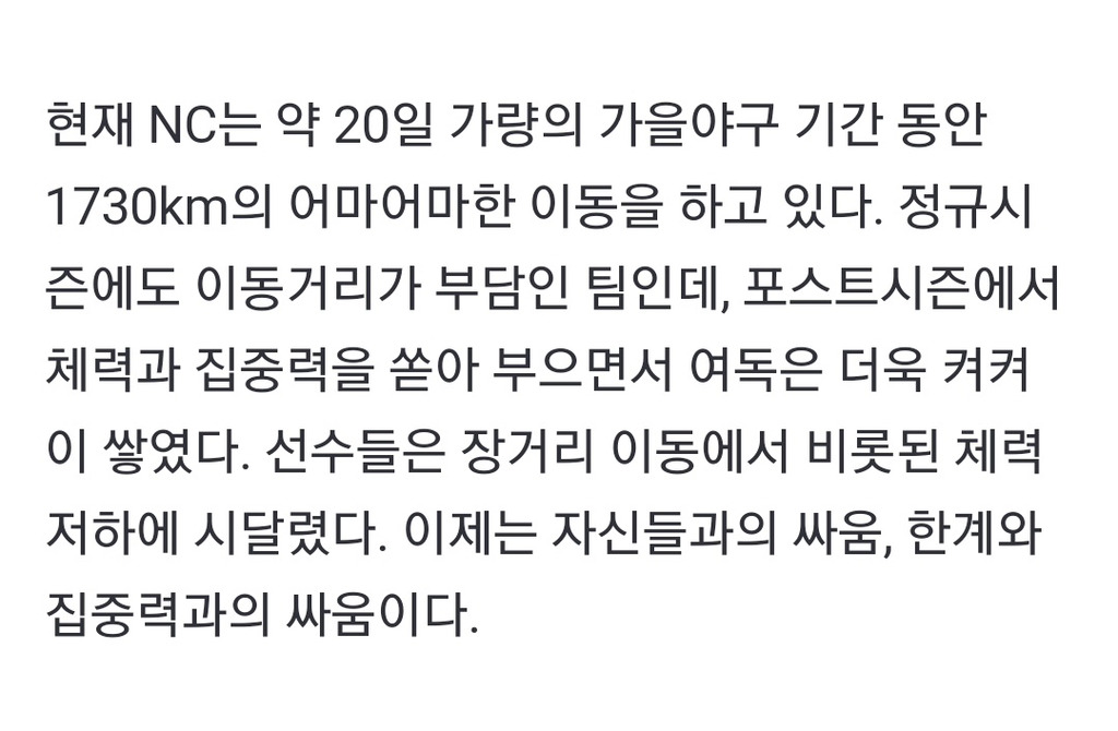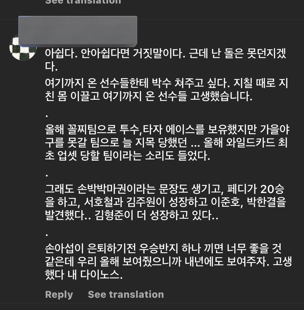 엔씨 공식 인스타 게시물 댓글인데…그냥 하염없이 눈물이 나…그저 하염없이 서글퍼져…“누가 뭐래도 올 가을은 엔씨의 민트빛으로 물들였습니다“다들 수고많았어요 다이노스🥹🩵