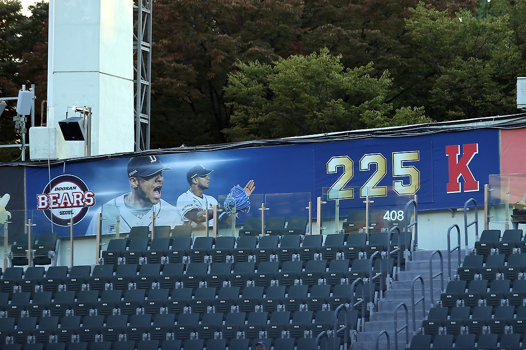 2001년 두산 베어스의 아리엘 미란다가 KBO 시즌 최다 탈삼진 신기록인 225탈삼진을 기록하자 외야 관중석 뒤쪽벽에 기념 플래카드가 붙어 있다. 종전 기록은 1984년 최동원의 223탈삼진. ⓒ두산베어스