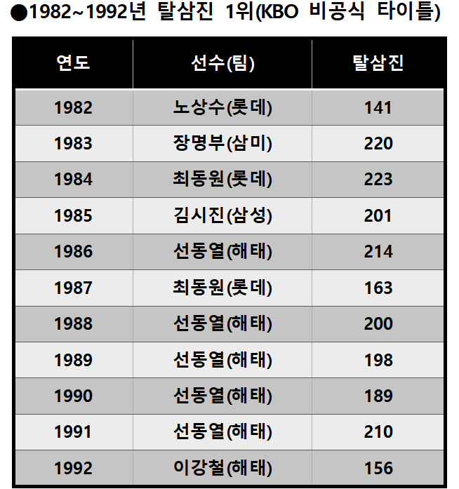 하지만 KBO 역사에서 ‘탈삼진’이 처음부터 이런 가치를 인정받은 것은 아니었다. 전문에 소개했듯이 KBO 공식 시상 타이틀로 대접받은 것은 1993년부터였기 때문이다. 다시 말해 KBO 출범 원년인 1982년부터 1992년까지 11년 동안은 투수의 탈삼진 기록이 참고용에 그쳤다는 의미다.
