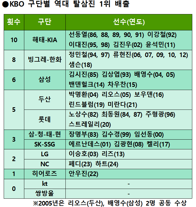◆구단별 탈삼진 1위 배출 현황…탈삼진왕 이모저모