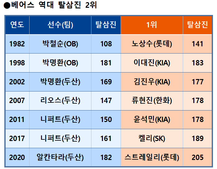 역대 한 시즌 최다 탈삼진은 2001년 두산 미란다의 225탈삼진. 역대 최소 탈삼진 개수로 1위에 오른 투수는 1982년 롯데 노상수로 141개다. 1982년엔 팀당 80경기 체제였다.