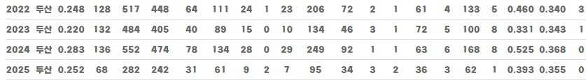 그러나 문제는 FA 계약 이후였다. 거액의 계약과 함께 돌아온 성적은 실망 그 자체였다. 2022시즌부터 현재까지, 김재환은 팀을 이끄는 4번 타자라기보다는, 오히려 공격 흐름을 끊고 찬스를 무너뜨리는 존재로 전락했다. 결정적 순간마다 몸쪽 볼에 속수무책으로 삼진을 당하고, 출루조차 버거워하는 그의 모습은 팬들에게 깊은 허탈감을 안겼다.