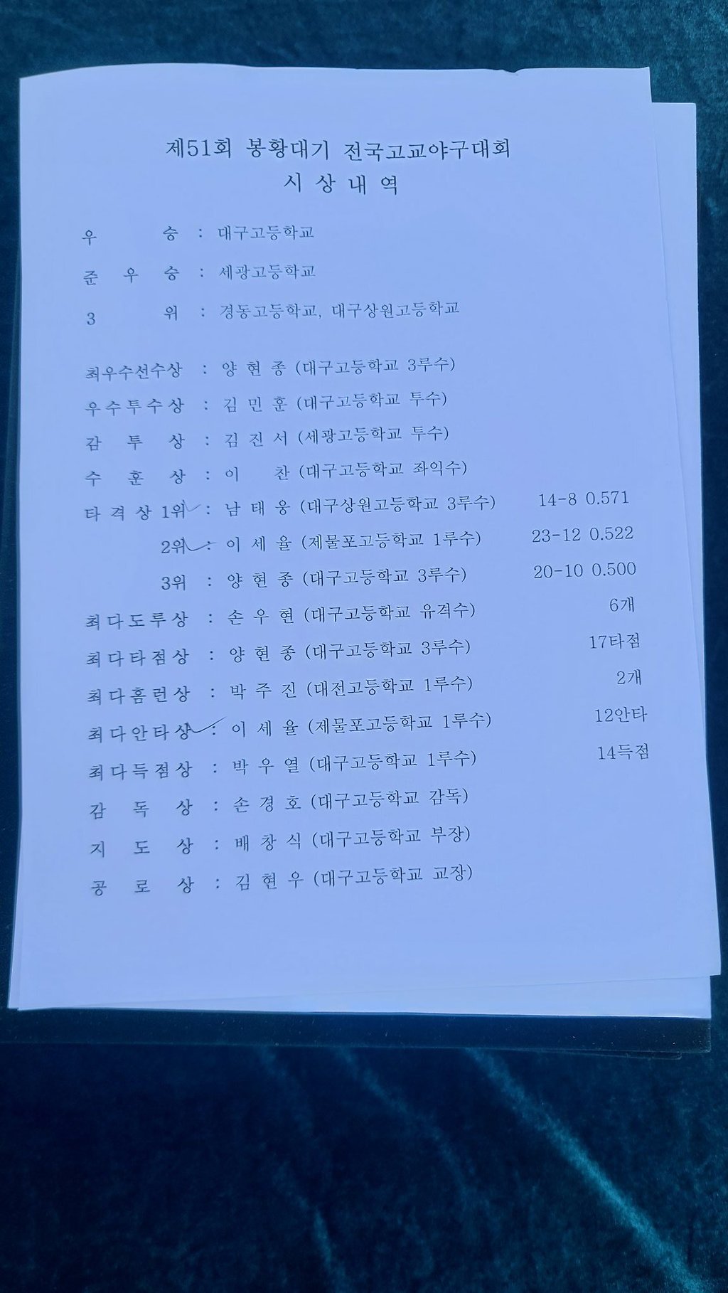 봉황대기 시상내역 보니까