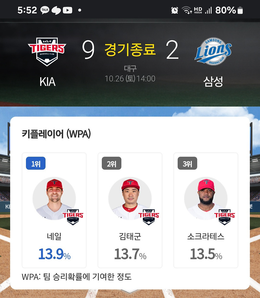 오늘 기아가 이긴다면 역시 김태군을 또 꼽겠다. 기자단이나 경기기록관은 네일을 꼽을 지도 모르겠다. ㅡㅡ> 경기 후 포털사이트 다음의 경기 수훈정도를 보니 실제로 네일, 김태군, 소크라테스 순이다.