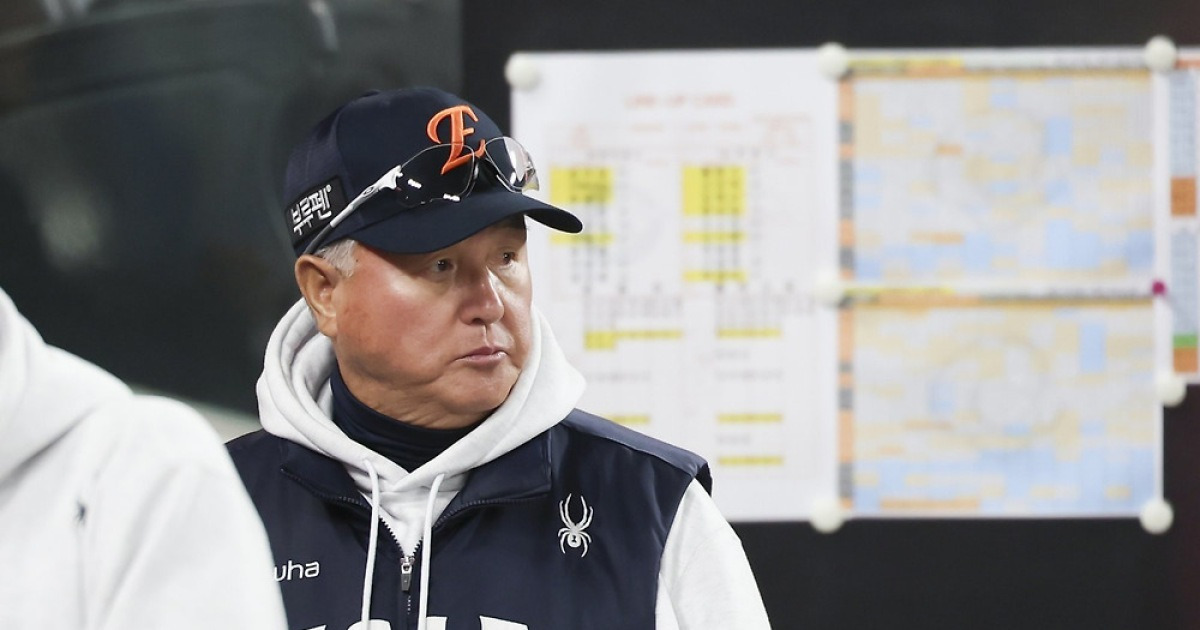 한화 김경문 감독이 31일 대전한화생명볼파크에서 열린 ‘2025 신한 SOL 뱅크 KBO PS’ LG와 한국시리즈 5차전 도중 그라운드를 응시하고 있다. 대전|뉴시스쏠린 기대에 비해 결말은 좋지 않았다. 19