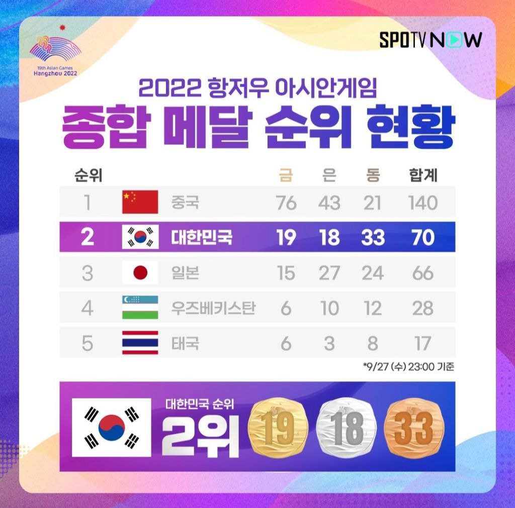 2022 항저우 아시안게임 종합 메달 순위 현황