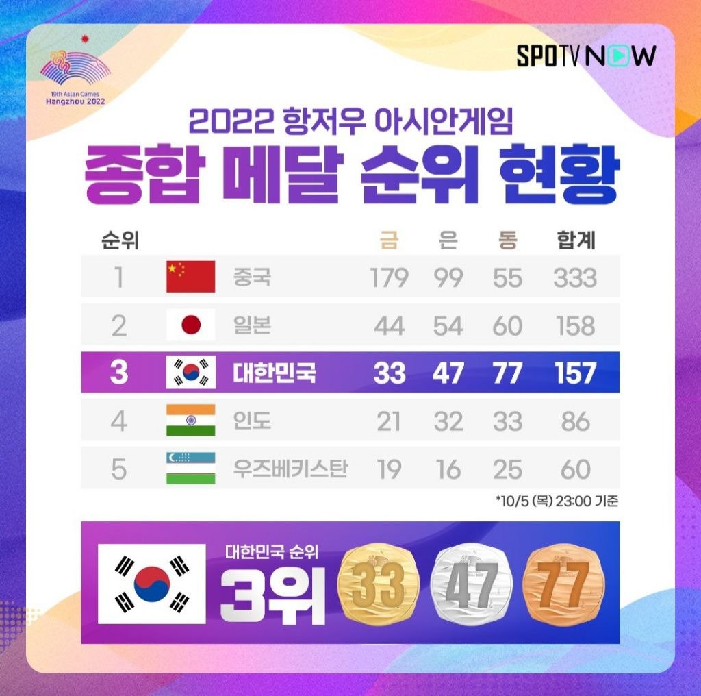 2022 항저우 아시안게임 종합 메달 순위 현황