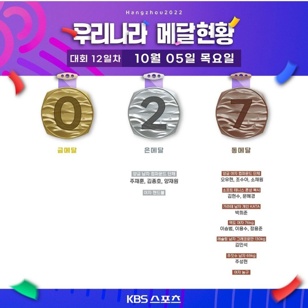 2022 항저우 아시안게임 대회 12일차 우리나라 메달현황