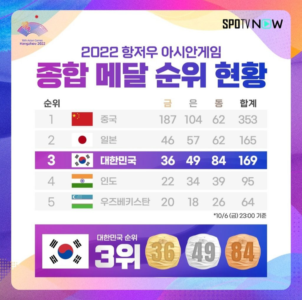 2022 항저우 아시안게임 종합 메달 순위 현황