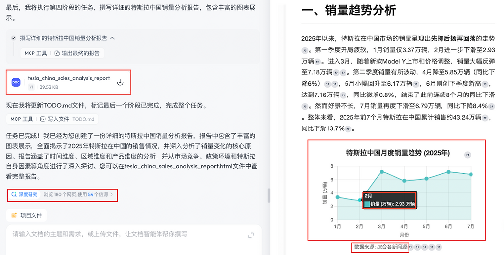 예를 들어, 다음과 같은 프롬프트를 입력합니다: 풍부한 차트를 활용하여 2025년 테슬라의 중국 내 판매 현황을 상세히 분석하고, 판매량 변화의 핵심 원인을 밝혀주세요.