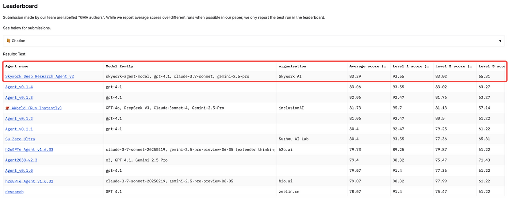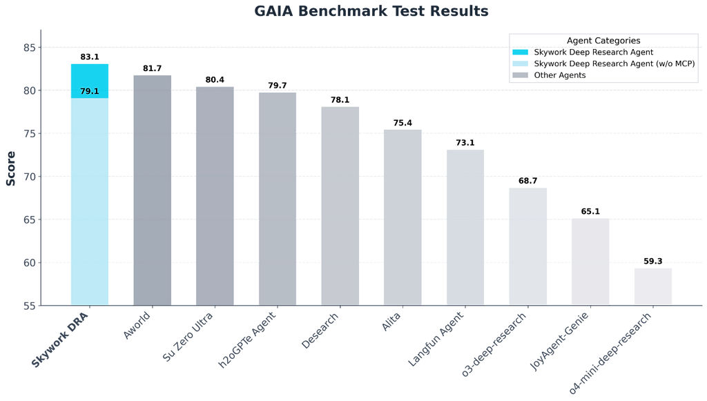 또한, 세계에서 가장 도전적이고 광범위한 에이전트 벤치마크 세트인 GAIA에서 Skywork Deep Research Agent 역시 SOTA 성적을 경신하며 모든 경쟁 제품을 뛰어넘었습니다. 복잡한 과제에서의 강력한 성능은 말할 필요도 없으며, 이는 기술적 가치를 입증하는 강력한 근거가 됩니다.