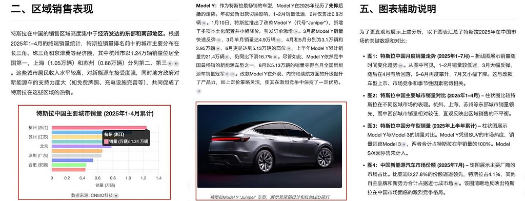 보고서에는 테슬라 중국 월별 판매량 추이 선형 차트, 주요 도시 판매량 막대 차트, 중국 신에너지차 시장 점유율 파이 차트 등 풍부한 차트 자료가 포함됩니다. 더 중요한 점은 이미지에 담긴 정보를 보고서 본문 내용에 자연스럽게 통합하여 보다 포괄적인 텍스트 해석을 제공한다는 것입니다.