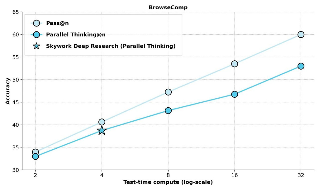 병렬 사고 모드에서 Skywork Deep Research의 정확도는 사고 시간이 길어질수록 지속적으로 상승하여 자체 개발 시스템 아키텍처의 추론 깊이와 확장성 측면에서 막대한 잠재력을 입증했습니다.