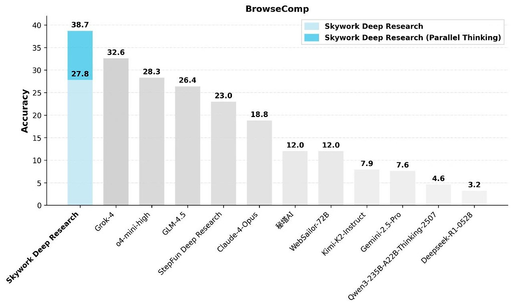 성능이 얼마나 뛰어난지, 먼저 벤치마크 점수를 공개합니다. 먼저 권위 있는 검색 평가 순위인 BrowseComp에서 Skywork Deep Research는 일반 추론 모드에서 정확도 27.8%를 달성해 GLM-4.5, StepFun Deep Research, Claude-4-Opus 등 국내외 대부분의 주요 동종 제품을 앞섰습니다. 자체 개발한 ‘병렬 사고’ 모드를 활성화하면 정확도는 38.7%로 급상승하며 업계 SOTA 기록을 단번에 경신, Grok-4를 포함한 모든 경쟁 제품을 제쳤습니다.
