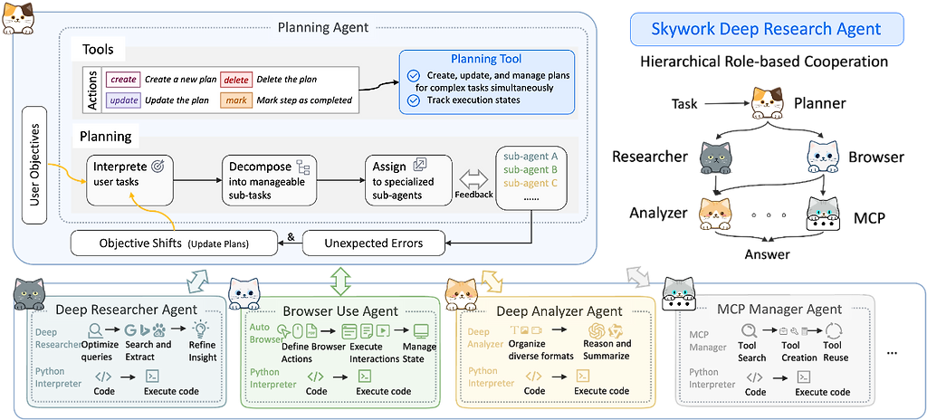 이러한 MCP 매니저 에이전트를 기반으로, 모델 능력과 도구 능력을 결합한 협업 다중 에이전트 프레임워크가 형성되었습니다. 이는 다중 에이전트의 협업을 효율적으로 조직할 뿐만 아니라, 동적으로 MCP 도구를 생성함으로써 임무 대응 능력과 환경 적응 능력을 강화합니다. 아래 전체 아키텍처 도면에는 계획 에이전트, 심층 조사 에이전트, 브라우저 사용 에이전트, 데이터 분석 에이전트 및 MCP 매니저 에이전트가 각각 표시되어 있습니다.