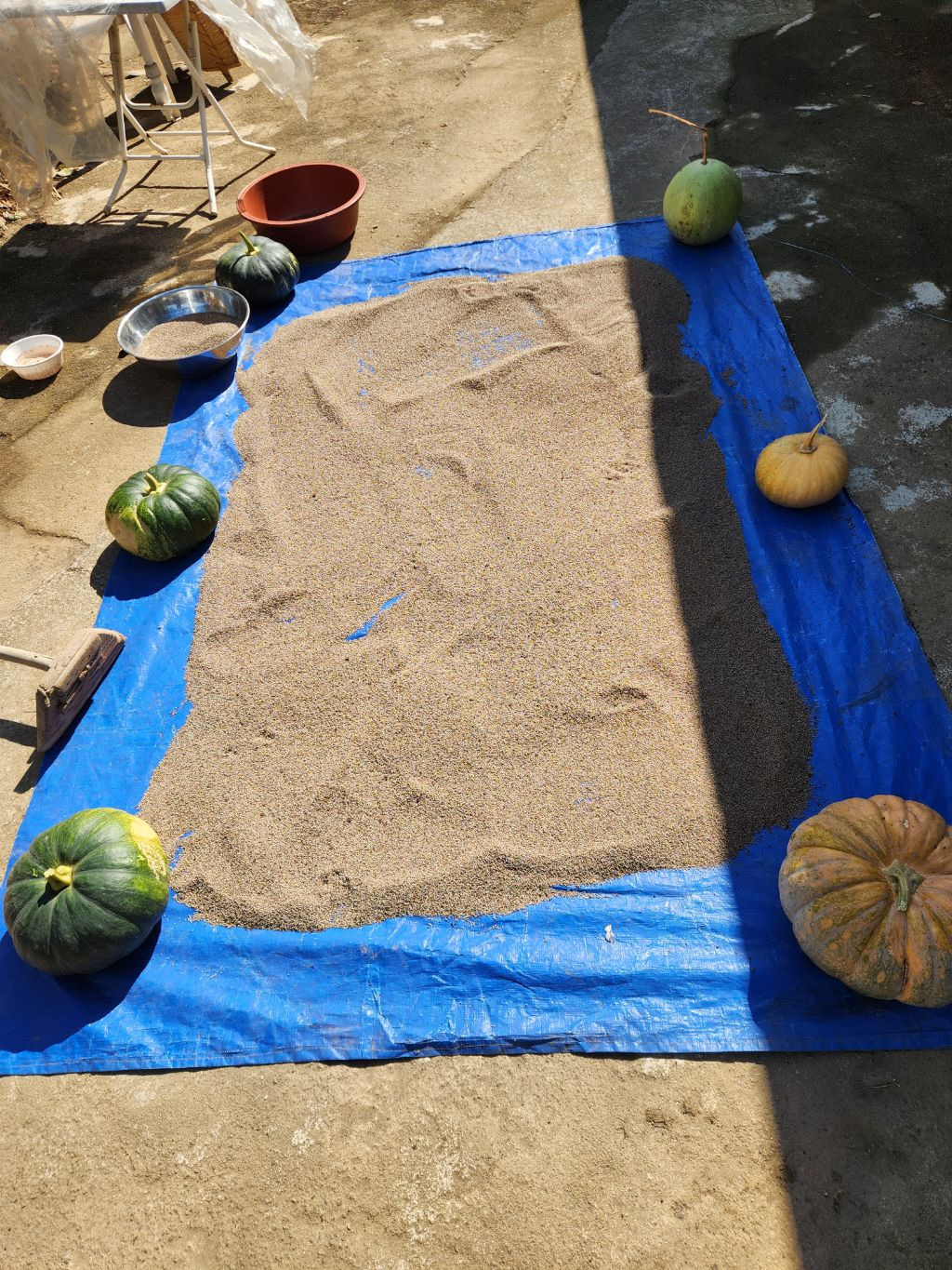 선풍기에 껍데기 날리고 들깨 말리기