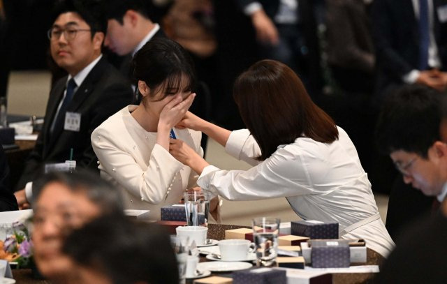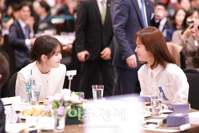 옆자리에 앚은 한지민이 아이유의 리본 위치를 보고 바로 잡아주는 모습이 사진에 포착🥰