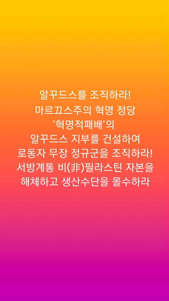 알꾸드스를 조직하라!마르끄스주의 혁명 정당 '혁명적패배'의알꾸드스 지부를 건설하여로동자 무장 정규군을 조직하라!서방계통 비(非)필라스틴 자본을 해체하고생산수단을 몰수하라
