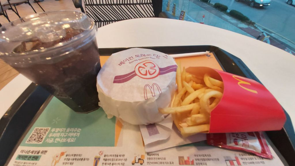키오스크에서 베이컨토마토 디럭스세트 선택하고 쿠폰 결재하고, 위층 테이블에 앉으니 직원이 가져다 주네요.