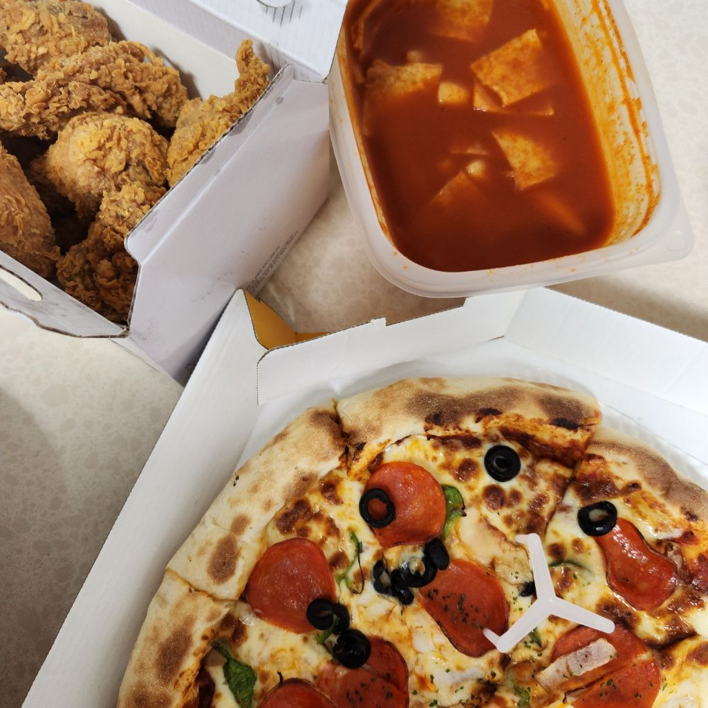 오늘 저녁은 아직이고 어제 저녁 자랑!맘스터치 치킨+피자+떡볶이!!!치킨최고
