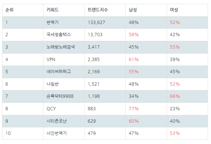 성별 선호도 분석 결과 1위 번역기는 남성 48%, 여성 52%, 2위 국세청홈택스는 남성 58%,