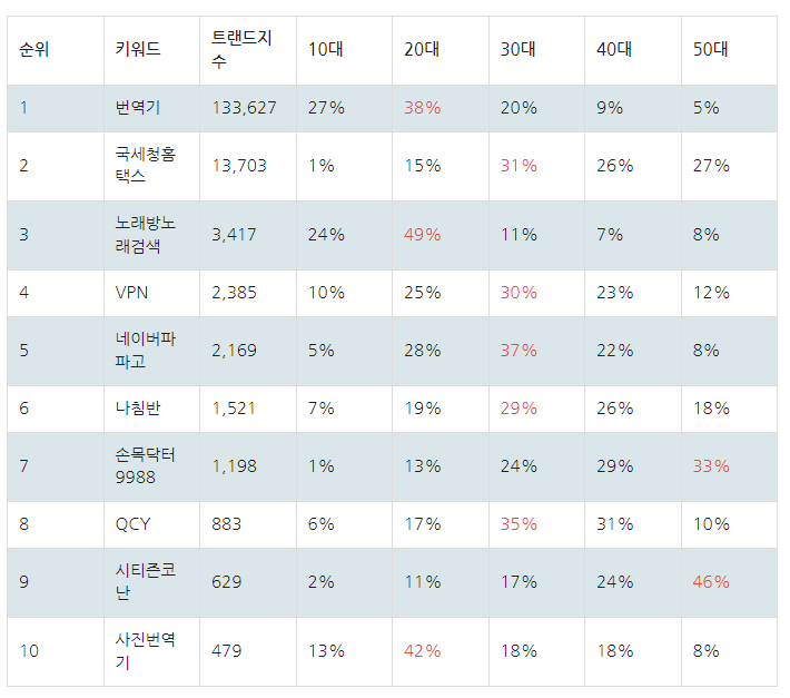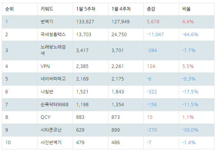 1위 번역기·2위 국세청홈택스·3위 노래방노래검색,