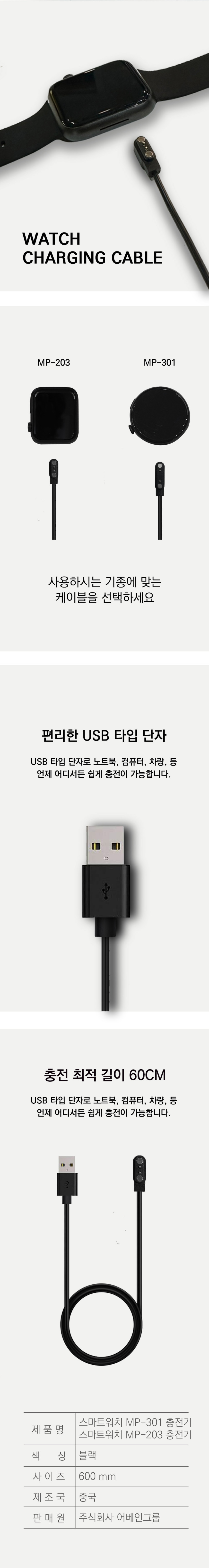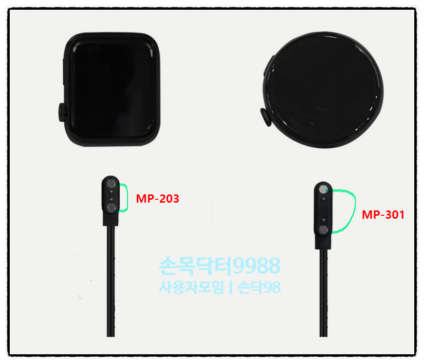 보시면 알겠지만 MP-203이나 MP-301 워치 충전기 케이블이 틀립니다.