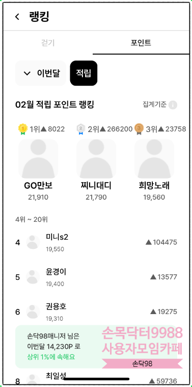 아직 '손목닥터9988 걷기와 포인트' 랭킹보기는 아직입니다 ㅎ