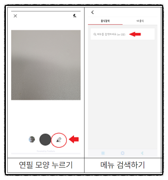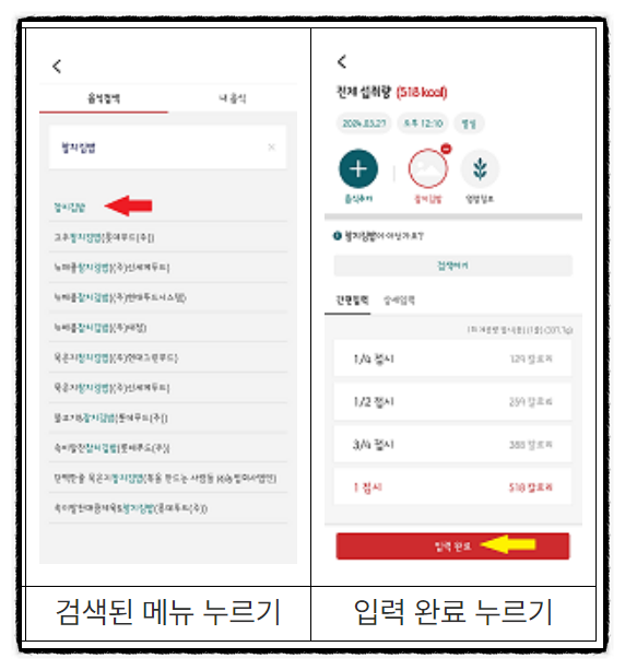 식단입력 시 사진찍기나 기존 사진등록이 아닌 음식 검색을 통해 식단 기록을 해주시면