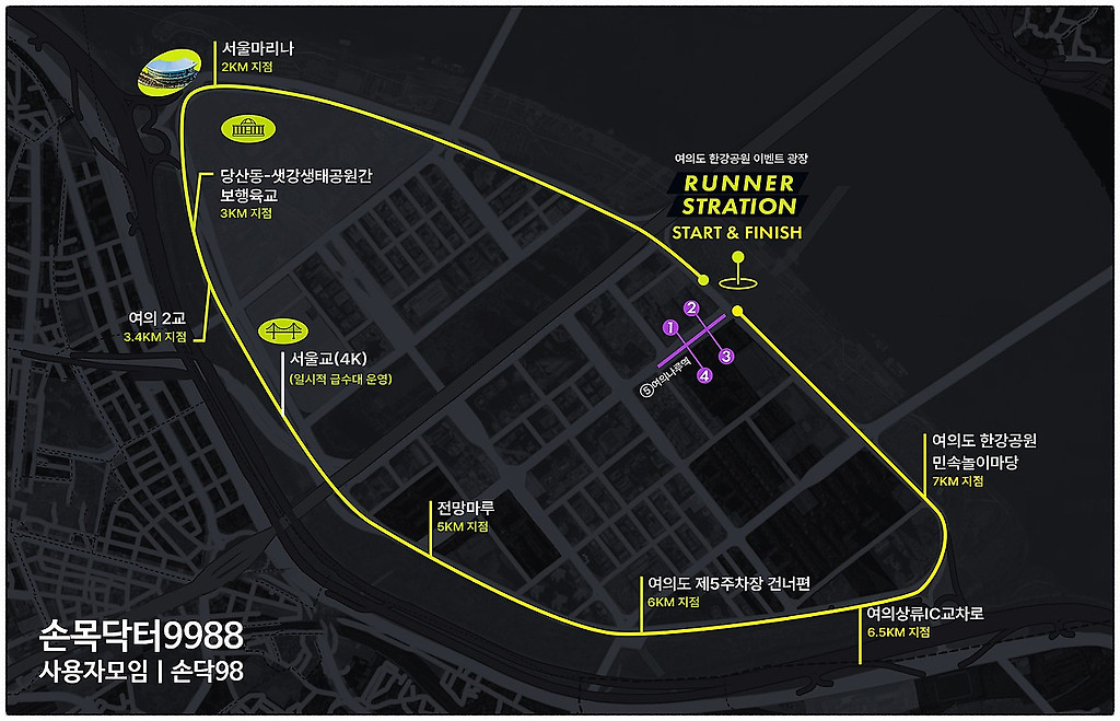 러너스테이션 개관 기념 여의도 둘레길(8.4Km) 걷기 손목닥터 9988이벤트를 진행합니다.