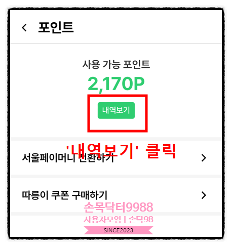 '포인트' 화면으로 넘어오면 화면 중앙에 있는 '2,170P 내역보기'를 클릭합니다.