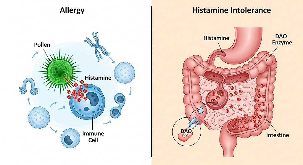 히스타민 불내증은 면역계의 과민 반응이 아니라, 체내에서 히스타민을 분해하는 효소(DAO, 다이아민 옥시다제)가 부족하거나 기능이 떨어져 생깁니다. 이 경우 히스타민이 몸에 쌓여 두통, 두드러기, 복부 팽만, 소화 불량, 불면 등이 발생할 수 있습니다. 따라서 알레르기와 히스타민 불내증의 가장 큰 차이는 면역 반응 여부라고 할 수 있습니다.