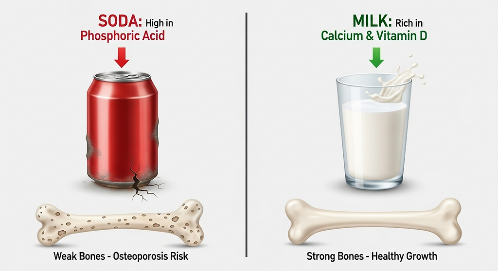 또한 탄산음료는 대부분 카페인과 당분을 함께 포함하고 있습니다. 카페인은 소변을 통해 칼슘 배출을 증가시키며, 당분은 인슐린 분비를 자극해 칼슘 대사에 간접적인 영향을 미칩니다. 특히 설탕이 많이 든 탄산음료는 칼로리는 높지만 영양가는 거의 없어, 우유나 물 대신 마시는 습관이 지속될 경우 성장기 청소년의 뼈 형성에 큰 방해가 됩니다.