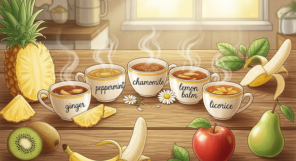 결국 소화에 좋은 차는 위를 따뜻하게 하고 긴장을 완화해주는 생강차, 캐모마일차, 페퍼민트차, 레몬밤차, 감초차이며, 소화가 잘되는 과일은 파인애플, 키위, 바나나, 사과, 배가 대표적입니다. 평소 식사 후 따뜻한 차 한 잔과 부드러운 과일을 곁들이면 위가 한결 편안해지고 소화력도 좋아집니다.