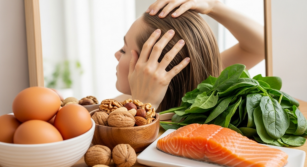 비타민 B군(특히 B7, 비오틴): 모근의 대사를 촉진해 건강한 모발 생성을 돕습니다. 달걀노른자, 견과류, 버섯, 통곡물로 섭취할 수 있습니다.