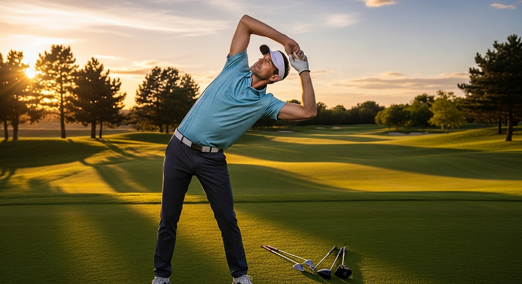 클럽을 어깨에 걸고 상체를 좌우로 천천히 회전시키는 동작도 효과적입니다.