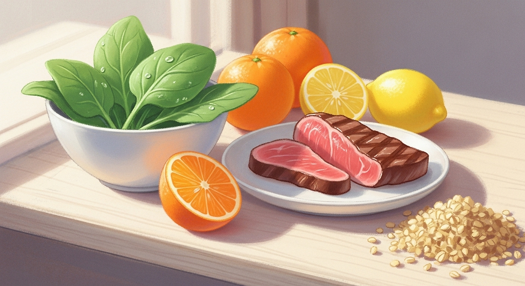 대표적인 빈혈에 좋은 음식과 흡수율 높이는 팁으로는 철분이 풍부한 식재료를 꾸준히 챙기기입니다. 시금치, 케일 같은 녹색잎채소는 식물성 철분을 제공하며, 살코기나 간에는 체내 흡수가 잘 되는 형태의 철분이 포함되어 있다고 알려져 있습니다. 식재료를 다양하게 섞어 섭취하면 부담 없이 영양을 보완할 수 있습니다.