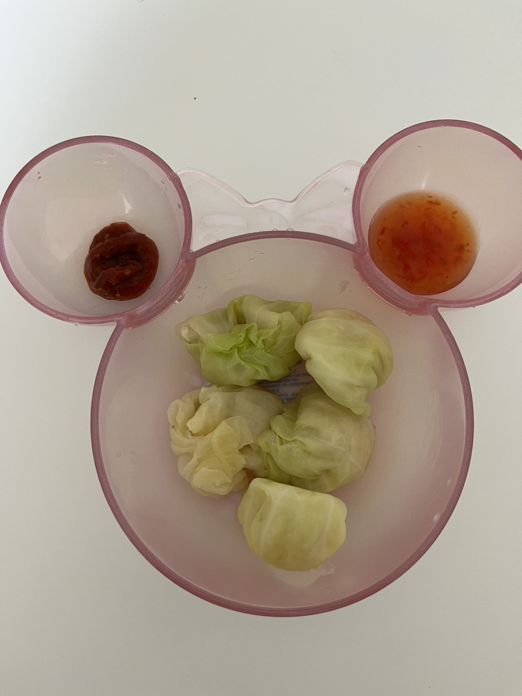 디즈니 랜드에서 구매한 미니마우스 그릇에 행복+1건강한 양배추 쌈으로 건강 +1