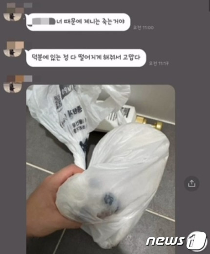 그러자 B 씨는 A 씨에게 동거하던 집에 있던 반려견 제니를 종량제봉투에 담은 사진과 함께 “너 때문에 제니는 죽는 거야”라는 메시지를 보냈다.