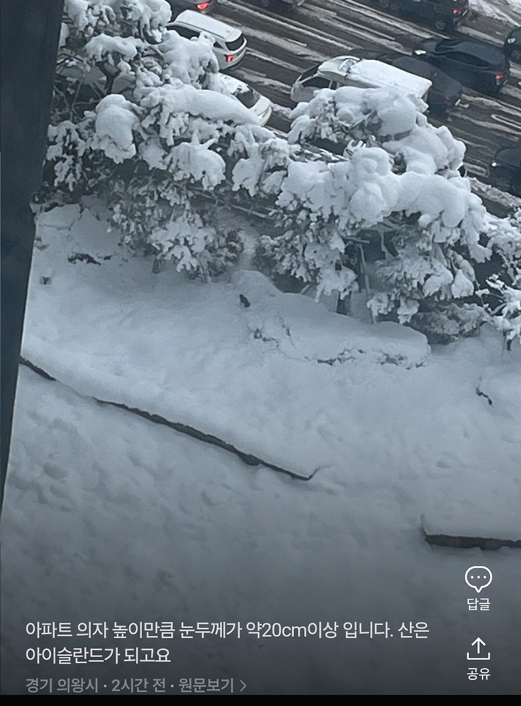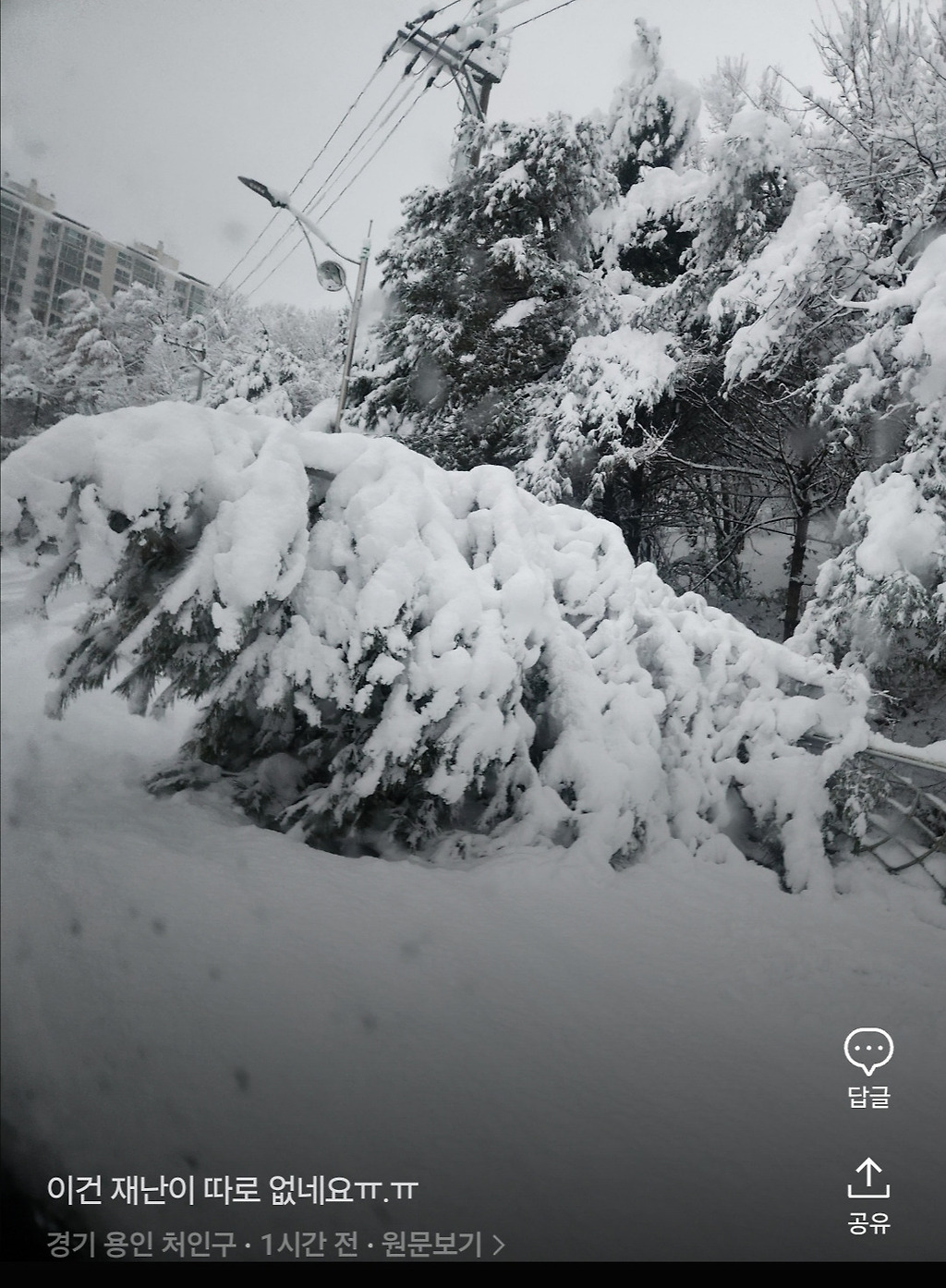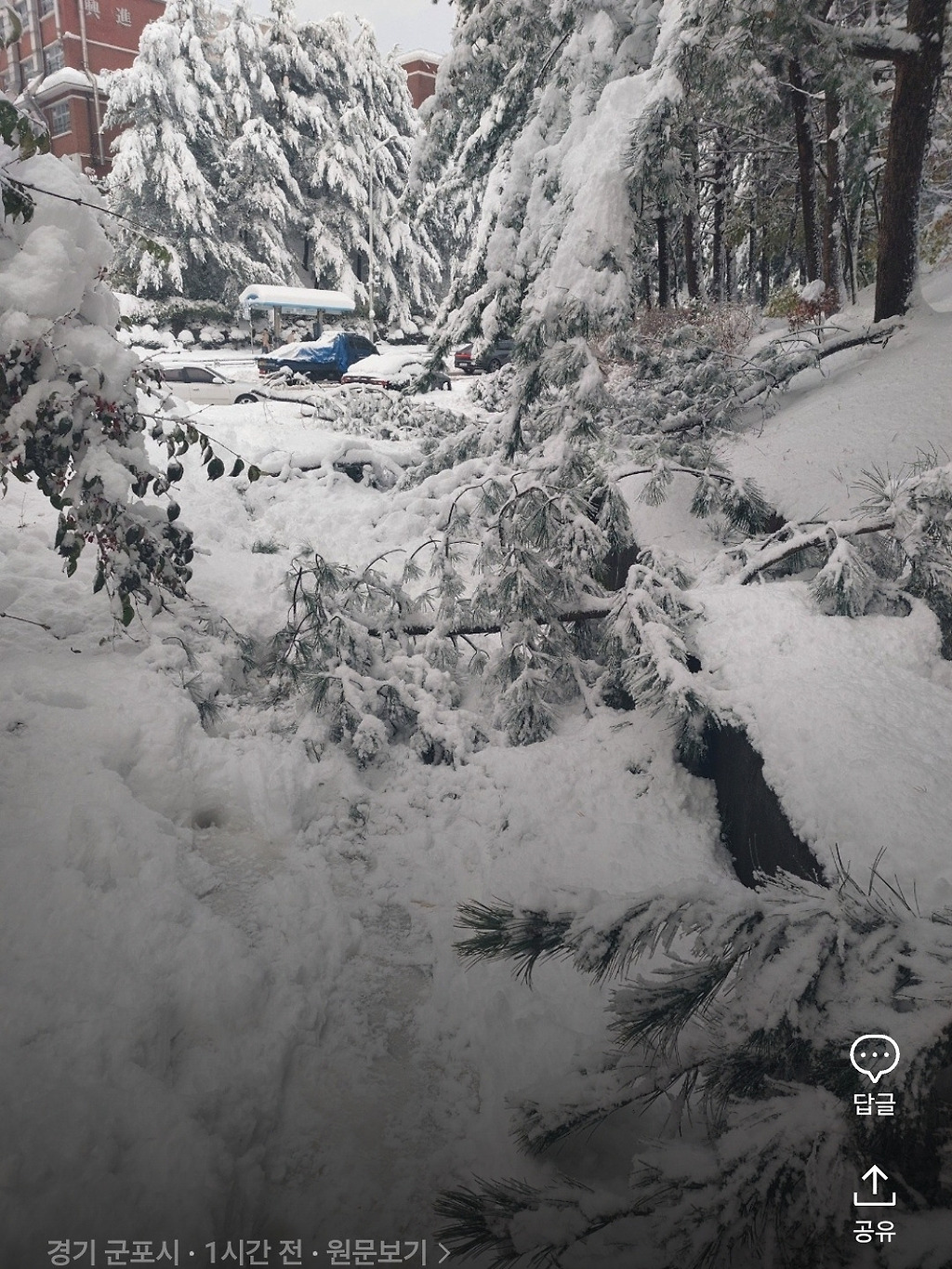 눈 무게를 이기지 못 한 나무들이 쓰러지고 있어서