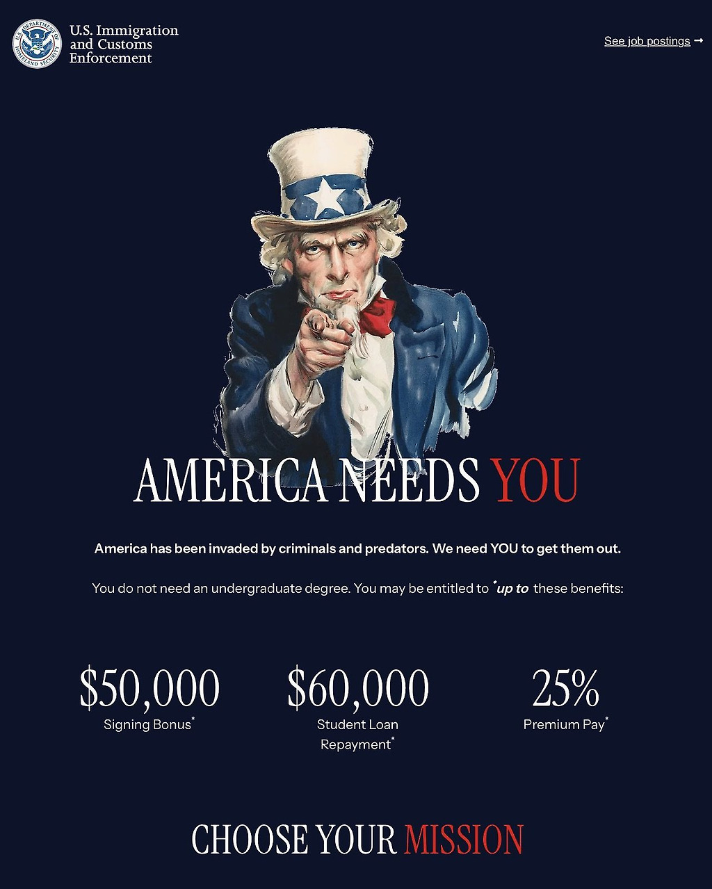 이민단속 집행관이 모자라서 무제한 신규 채용 공고를 냄.1. 채용 즉시 계약금 최대 5만 달러 지급.2. 학자금 대출 최대 6만 달러 탕감.3. 지원자격 중 학사 학위 필수 및 40세 이하 연령 조건 폐지.지원 사이트의 홍보문구가 웃김."미국은 범죄자들과 약탈자들의 침략을 받고 있습니다.""그들을 구출하려면 여러분의 도움이 필요합니다."ㅊㅊ ㄷㅋ