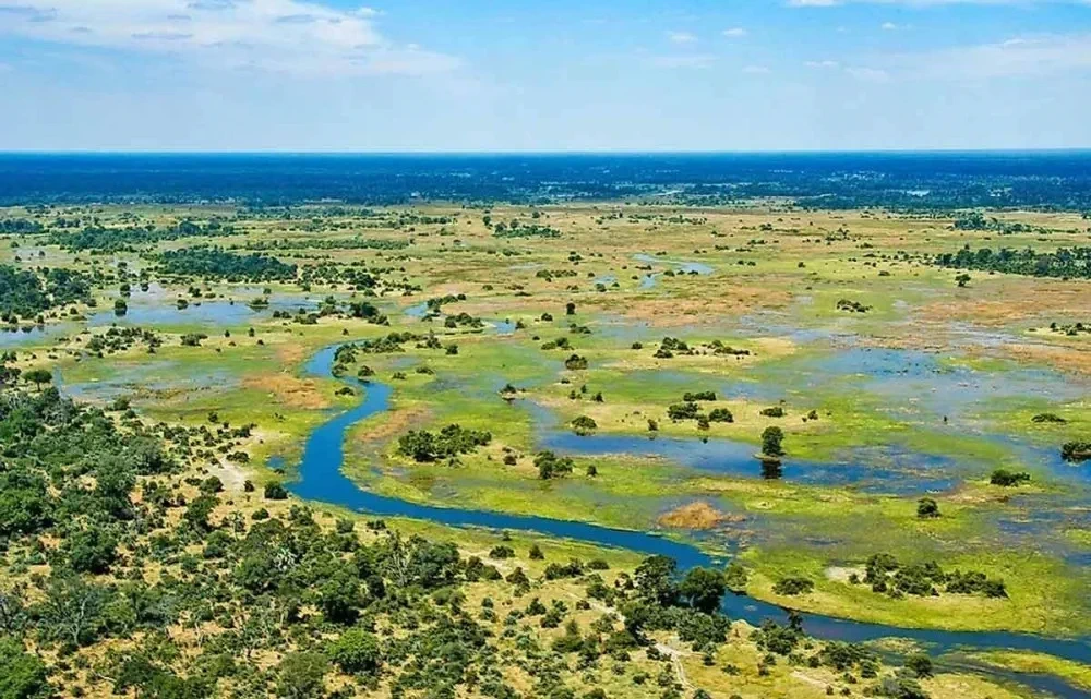 칼라하리 사막 한가운데 자리한 거대한 내륙 삼각주로, 바다로 흘러가지 않고 사막 속으로 스며드는 독특한 습지를 이룬다. 건기 동안 범람해 주변 식생이 물의 주기와 맞춰 성장하며, 지형도 매년 달라진다. 이곳은 1,000종이 넘는 식물과 수많은 어류·조류·포유류가 서식하는 유네스코 세계자연유산이다.