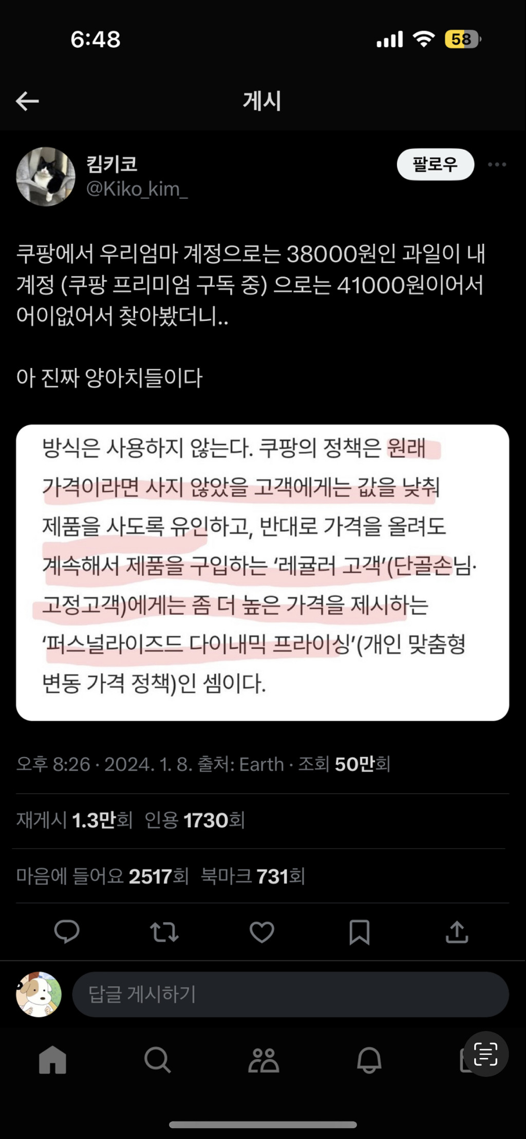 ++ 그리고 쿠팡 개양아치인점유효기간 임박한 제품 싸게 판다고 마감세일 카테고리 만들었는데어느새 마감세일에 올라온 식품들 전부 기존 원가보다 더 비싸게팔거나 원가에 팜원가 잘 모르는 소비자들이 마감세일에 올라와서 싸게파나보다 하고 사는데걍 유효기간 긴걸로 제가격 살수 있었던거 임박상품을 제가격에 산걸로됨 ㅋㅋ